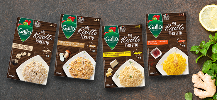 Η γκάμα προϊόντων Riso Gallo διαθέτει ριζότο Arborio, Carnaroli αλλά και ριζότο σε γεύσεις, φτιαγμένα από προσεκτικά επιλεγμένες ποικιλίες ρυζιού και υλικών.