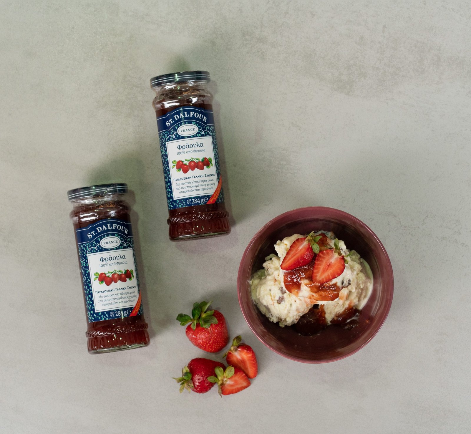 Εξαφανίζεται το παγωτό από το μπολ σου πριν καν το αντιληφθείς; Ο σεφ Θεόδωρος Ελευθερίου σου δείχνει πως να το φτιάξεις στο σπίτι με μαρμελάδα St.Dalfour φράουλα χωρίς γλουτένη και πρόσθετη ζάχαρη! Δες πιο κάτω τα υλικά!