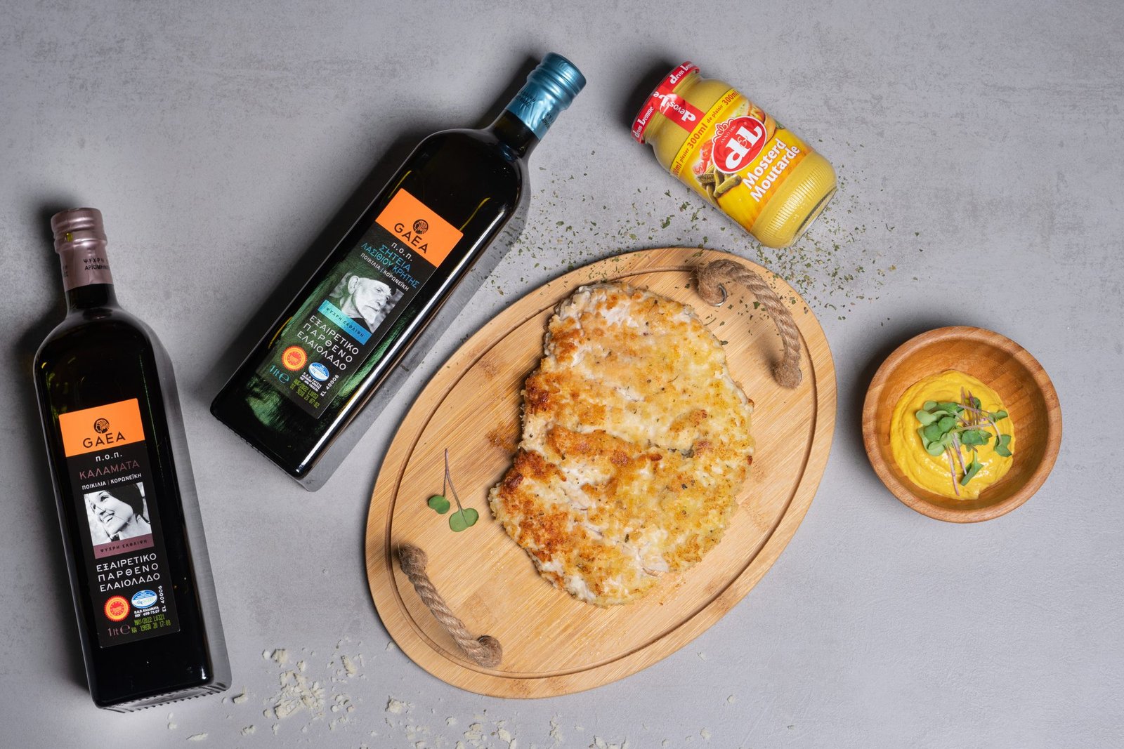 Κοτόπουλο σνίτσελ με μεσογειακά αρωματικά, ελαιόλαδο GAEA και μουστάρδα D&L από τον σεφ Γιάννη Γιαγκουλλή