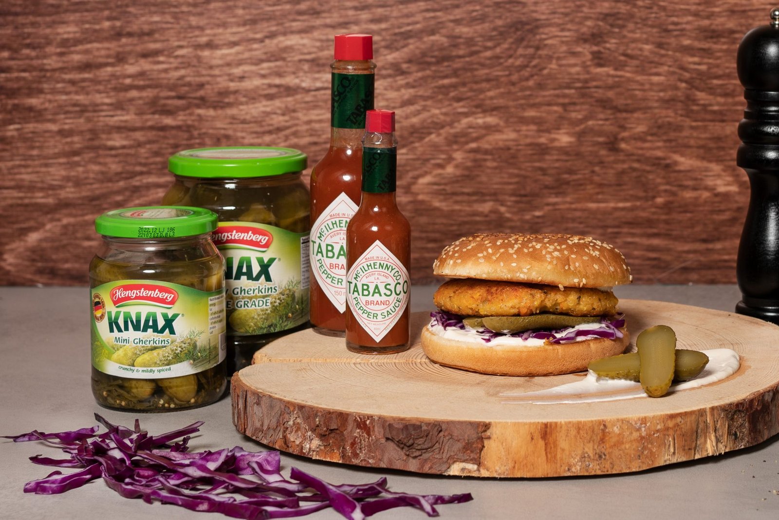Προσθέτουμε στο ψωμάκι το κραμπί, το τουρσί και τέλος το burger μας.