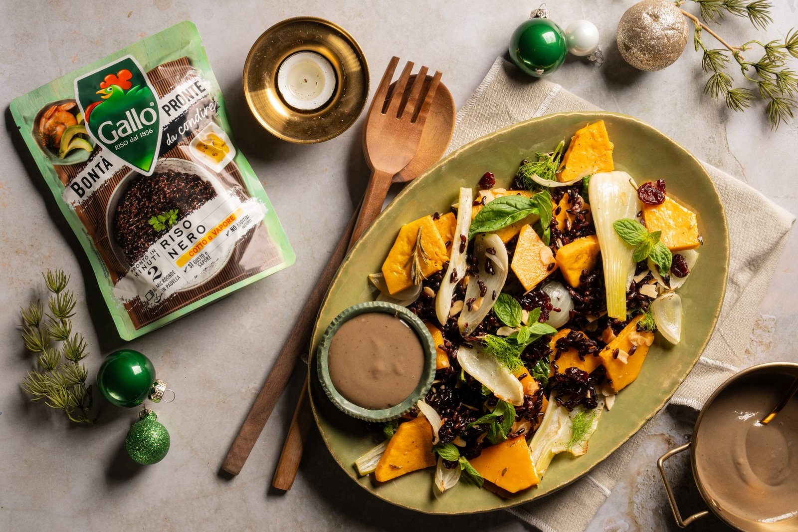 Επειδή η πρώτη εντύπωση μετράει, ανοίξτε το γιορτινό σας γεύμα με αυτή τη σαλάτα🥗 με κολοκύθα, αμύγδαλα, κράνμπερι και Riso Gallo Expresso Venere, και αφήστε τους καλεσμένους να αναρωτιούνται τι θα ακολουθήσει μετά!😉