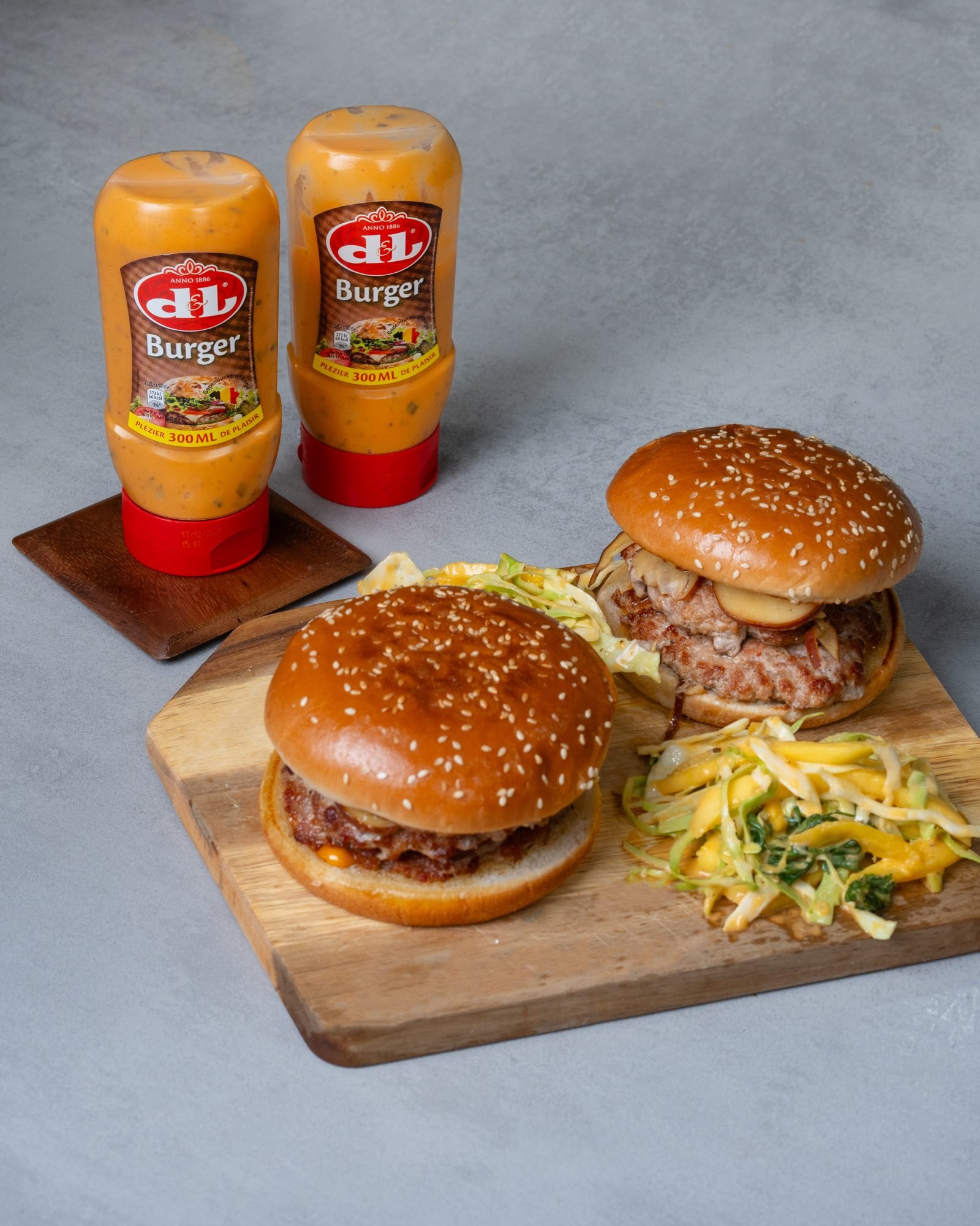 Συναρμολογούμε τα burgers βάζοντας τη D&L Burger Sauce και τη mango coleslaw στα ψωμάκια.