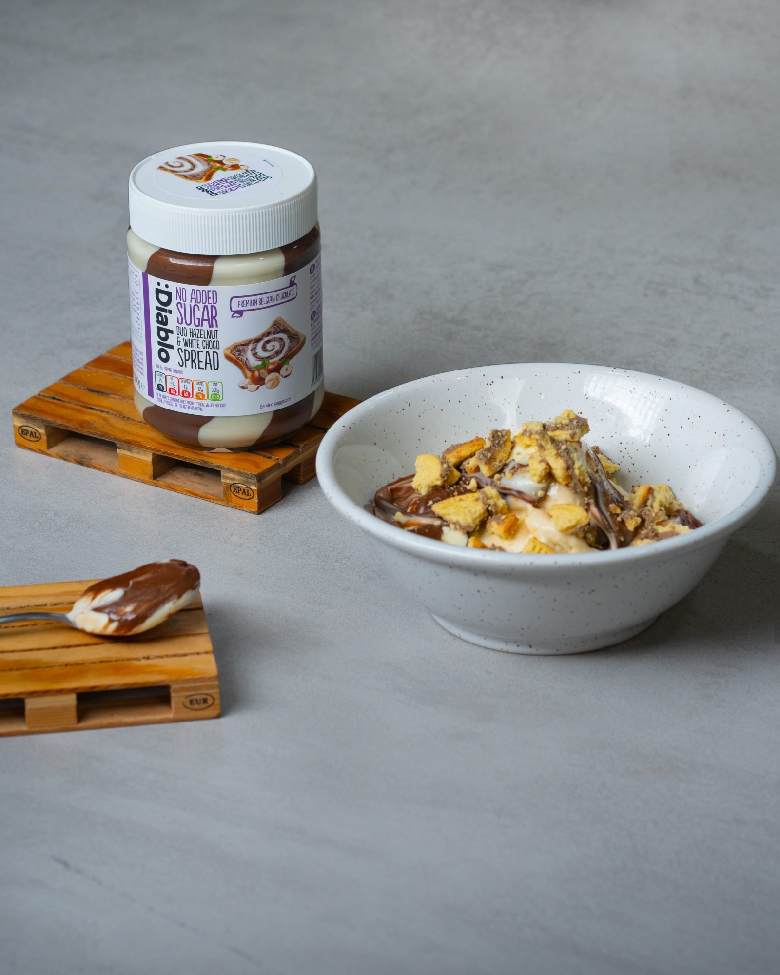 Μόλις το παγωτό είναι έτοιμο, σερβίρουμε με άφθονο Diablo άλειμμα φουντουκιού & λευκής σοκολάτας και πασπαλίζουμε με θρυμματισμένο μπισκότο.