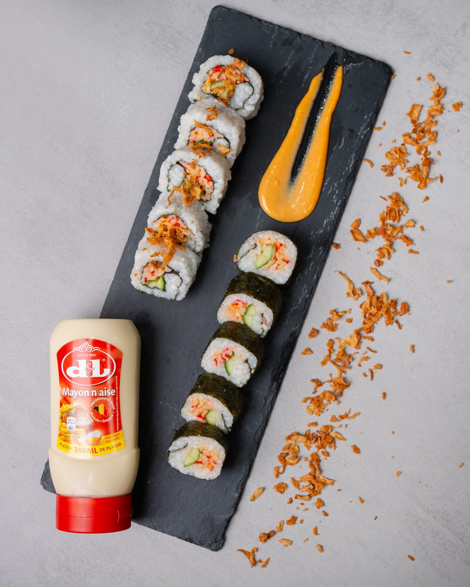 Κόβουμε το ρολό σε 8 ίσα κομμάτια και σερβίρουμε με επιπλέον μαγιονέζα D&L, sriracha και crispy onion.