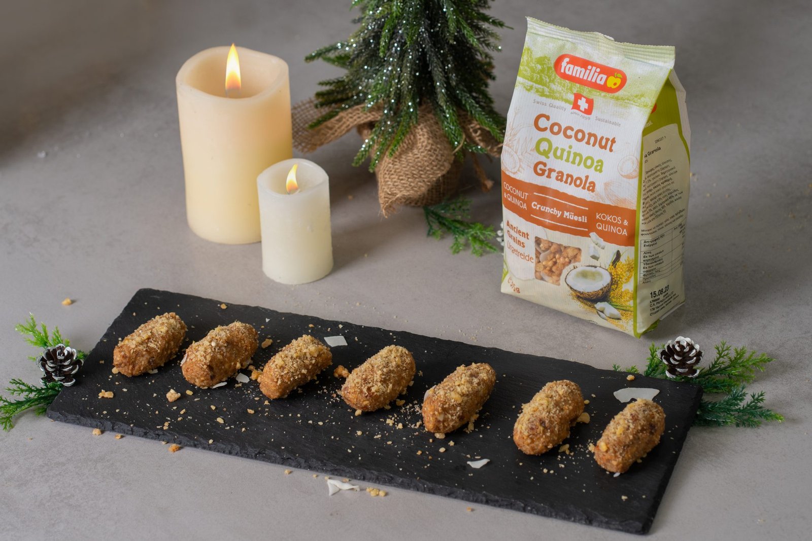 Vegan μελομακάρονα με Familia Coconut Quinoa Granola, χουρμάδες και αμύγδαλα από τον σεφ Γιάννη Γιαγκουλή