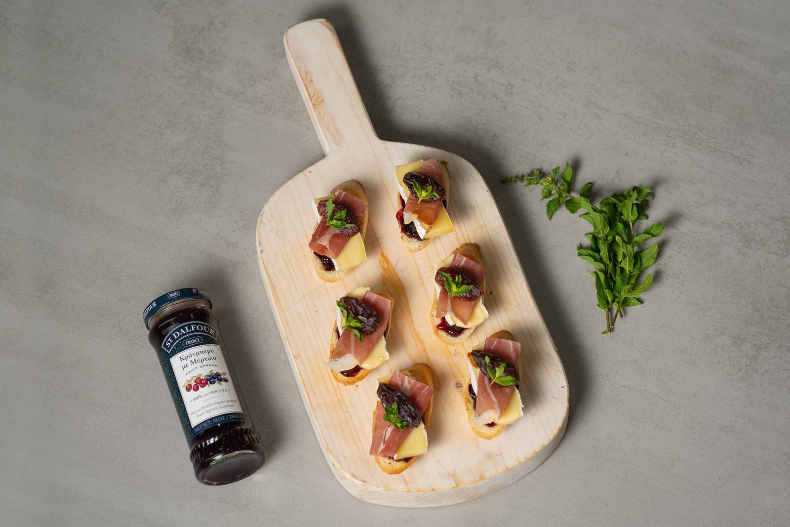 Τυρί brie, προσούτο, φοινίκια παστά, ρίγανη και μαρμελάδα St.Dalfour Κράνμπερι και Μύρτιλο 🥄 Τα 5 υλικά που χρειάζεσαι για να φτιάξεις τις πιο λαχταριστές και γρήγορες μπρουσκέτες που έχεις δοκιμάσει ποτέ! 😉 Δες πιο κάτω τη συνταγή!