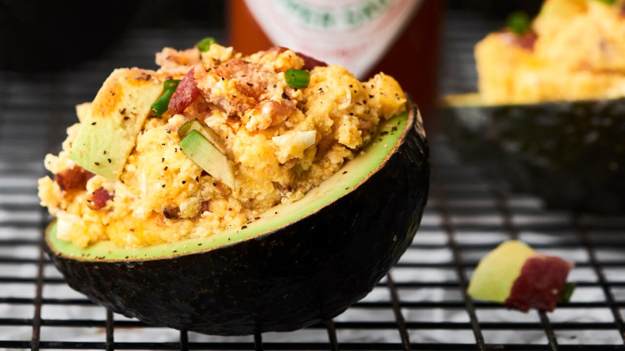Γεμίζουμε τα αβοκάντο ομοιόμορφα με το μείγμα αυγών και στην κορυφή προσθέτουμε σχοινόπρασο και μπέικον.