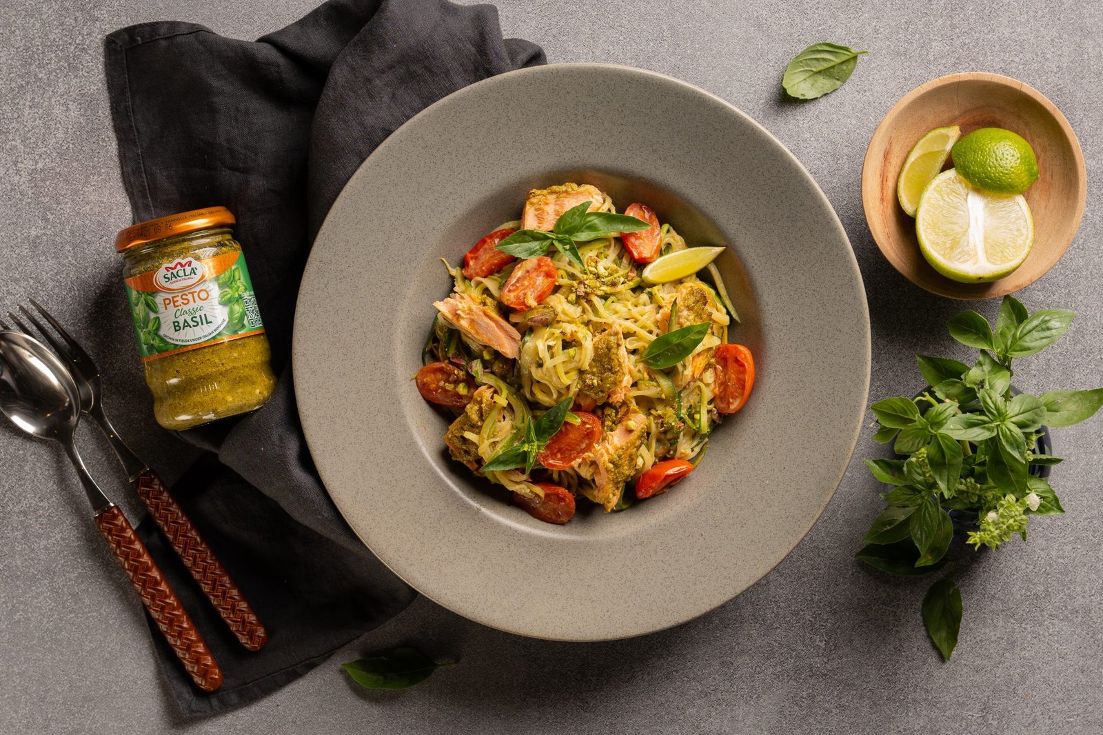 Comfort food… αλλά light 💪 Σολομός στο φούρνο με πέστο βασιλικού Sacla και spaghetti κολοκυθιού.🥒 Έυκολο, ελαφρύ και πλούσιο σε γεύση!