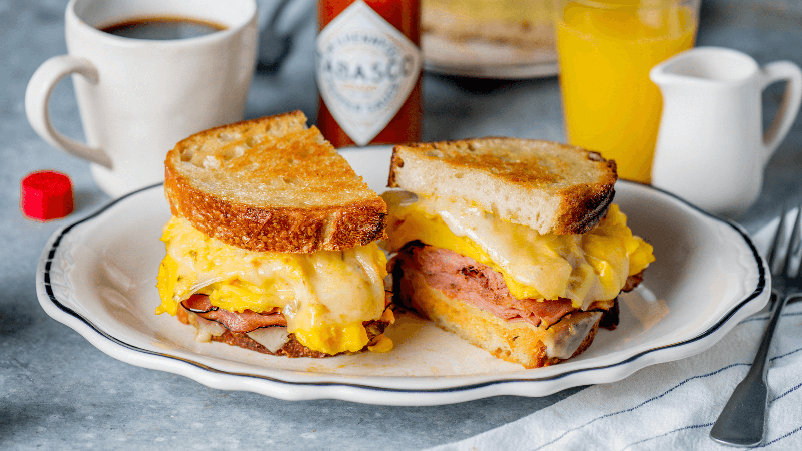 Τέλος, τοποθετούμε σε ένα πιάτο τις φέτες ψωμιού μαζί με το τυρί. Βάζουμε πάνω από το ψωμί το ζαμπόν, τα αυγά, λίγες σταγόνες TABASCO® Original Red Sauce και τοποθετούμε στην κορυφή ακόμη μια φέτα ψωμιού.