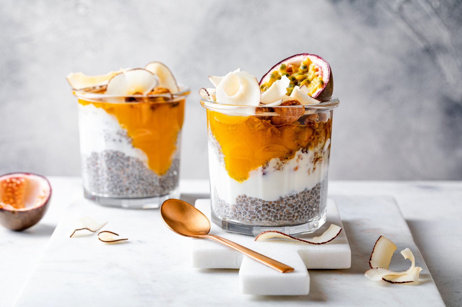 Πάνω από το μείγμα προσθέτουμε το γιαούρτι, έπειτα την γκρανόλα και από πάνω το κομπόστο σε γεύση μάνγκο. Τοποθετούμε πάνω από όλα τα υλικά τα passion fruit και τα chips καρύδας.