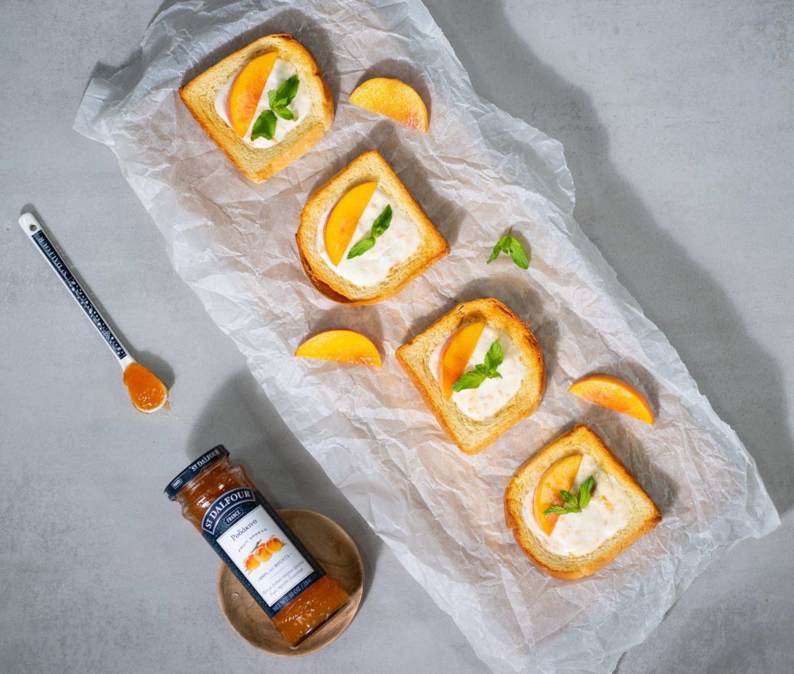 Σε μικρό μπολ ανακατεύουμε το γιαούρτι μαζί με τη μαρμελάδα ροδάκινο, αδειάζουμε το μείγμα στο κέντρο των δύο Brioche και απλώνουμε ομοιόμορφα.