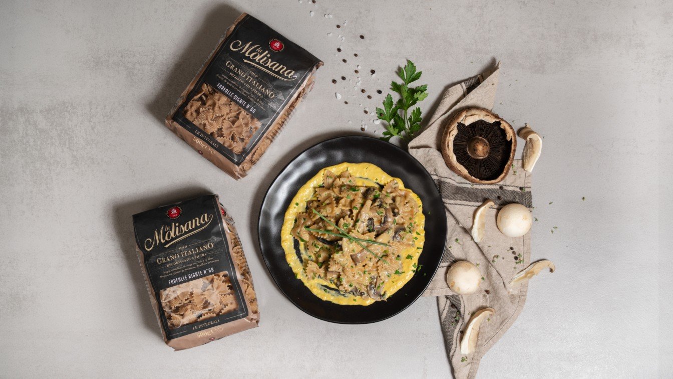La Molisana Farfalle Rigate Integrali με πουρέ καλαμποκιού και μανιτάρια από τους σεφ Θεόδωρο Ελευθερίου και Γαλάτεια Παμπορίδης