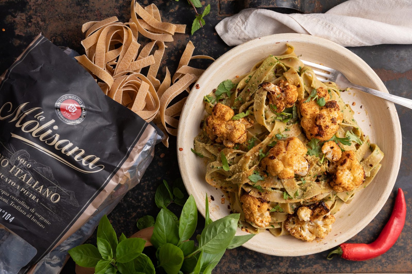 Θες να δημιουργήσεις κάτι διαφορετικό; Αυτή η συνταγή με Fettuccine Integrali La Molisana, πέστο και καβουρδισμένο κουνουπίδι από την σεφ Αθηνά Λοϊζίδης, θα κάνει την απόλαυση να είναι μονόδρομος! Δες πιο κάτω τα υλικά για να τη φτιάξεις!