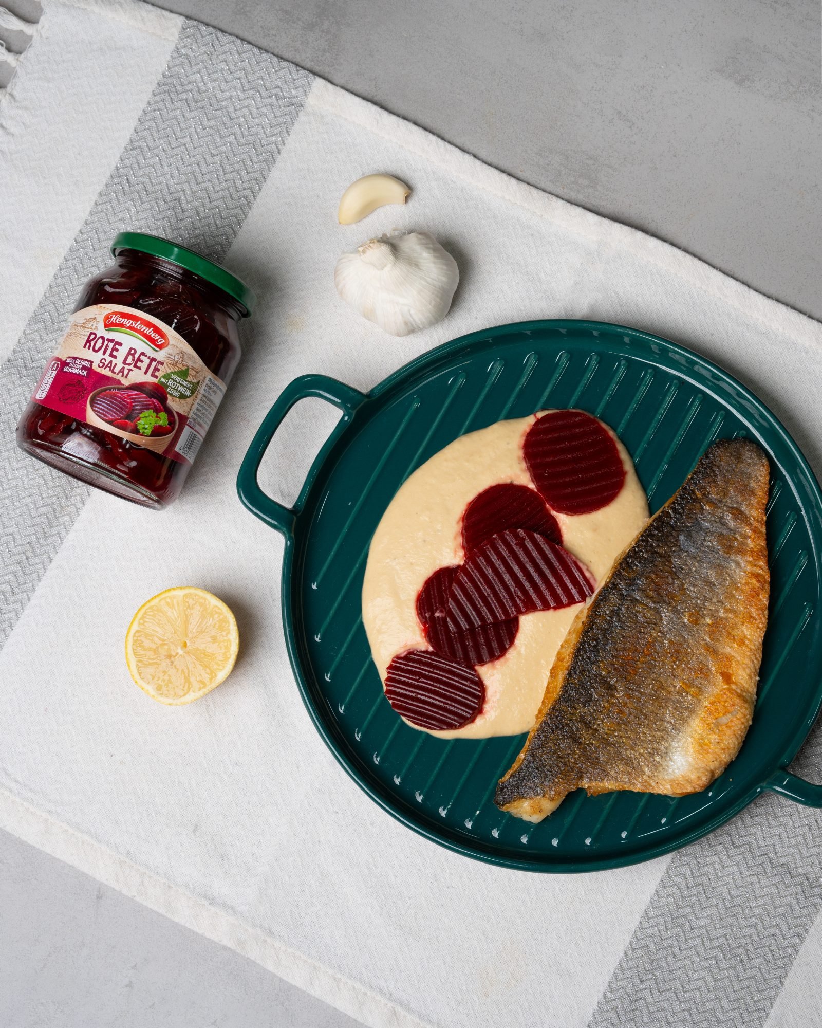 Σερβίρουμε: Βάζουμε το χούμους στη βάση του πιάτου, προσθέτουμε από πάνω την παντζαροσαλάτα Hengstenberg και τοποθετούμε το ψάρι δίπλα.