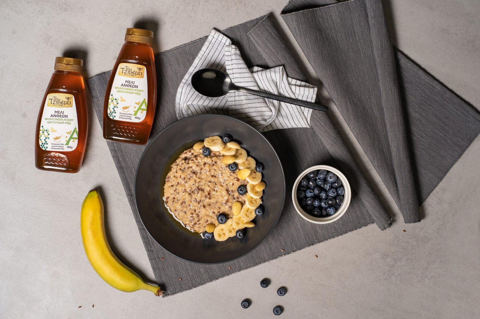 Σερβίρουμε σε μπολ. Προσθέτουμε στην επιφάνεια μπανάνα κομμένη σε φέτες, blueberries, τα αμύγδαλα και ακόμα λίγο μέλι.