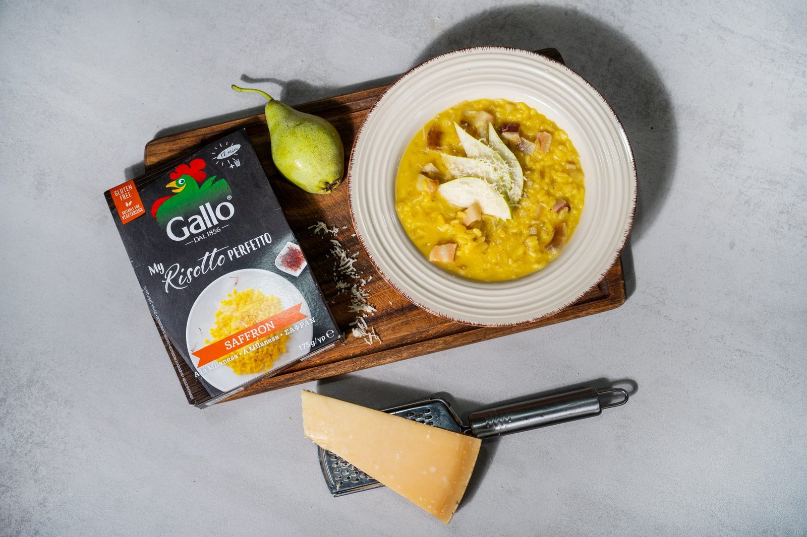 Αυτό το κρεμώδες ριζότο με Riso Gallo Saffron, αχλάδι και πανσέτα θα σε κατενθουσιάσει!