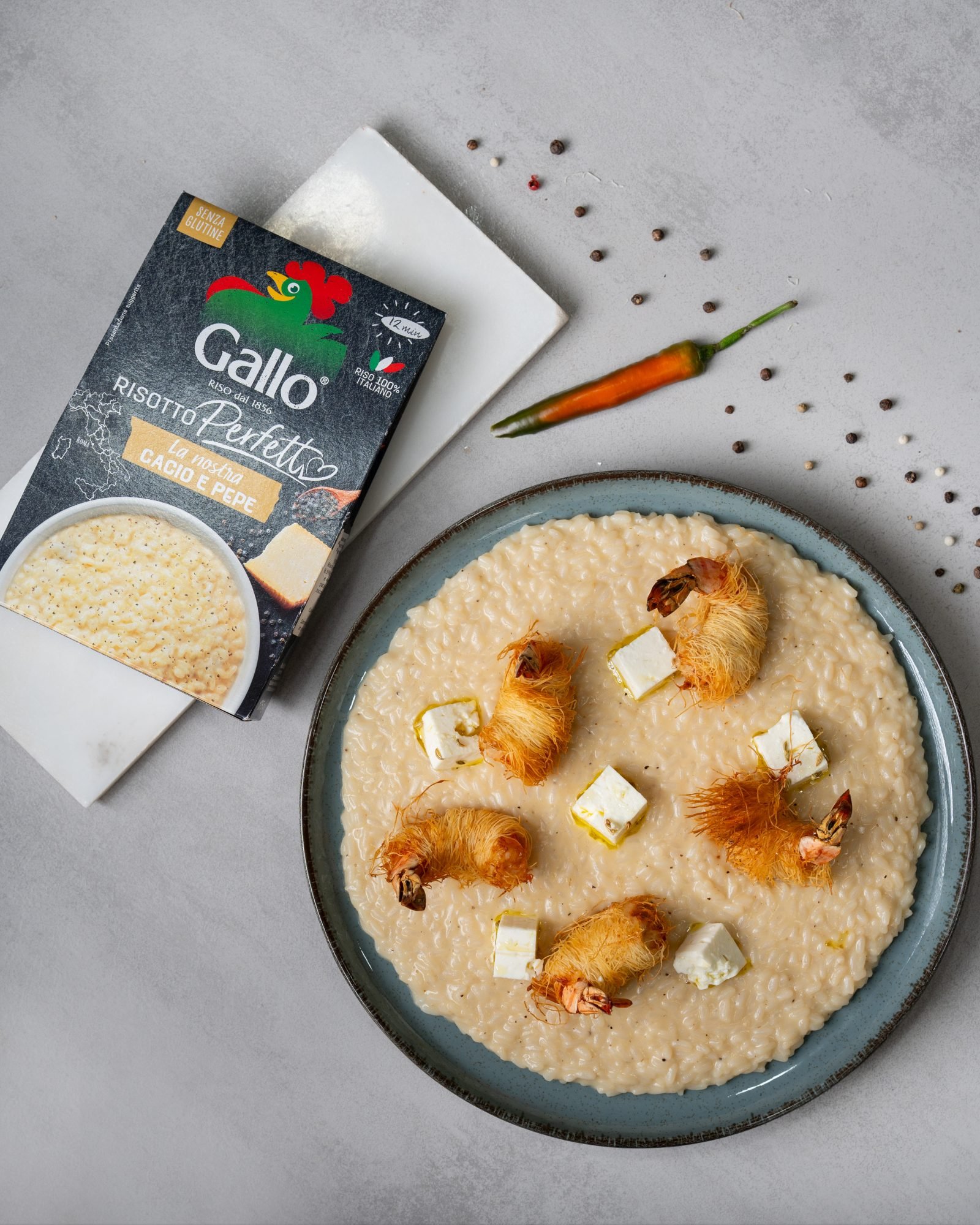 Ριζότο με Riso Gallo Cacio E Pepe, τραγανές γαρίδες τυλιγμένες με κανταΐφι και τυρί φέτα από τον σεφ Γιάννη Γιαγκουλή