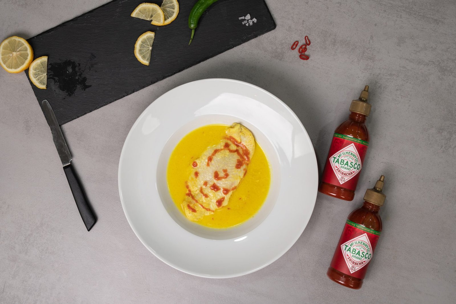 Σερβίρουμε σε ένα μπολ το ζωμό μαζί με το ψάρι και προσθέτουμε λίγο TABASCO® Sriracha Sauce.